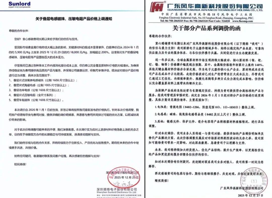 客岁12月,顺络电子、风华高新等电子元器件企业同样揭晓通告称,正在原原料本钱继续上涨、企业难以一律消化新增本钱的境况下,将对一面电感、电阻产物举行价值上调。
